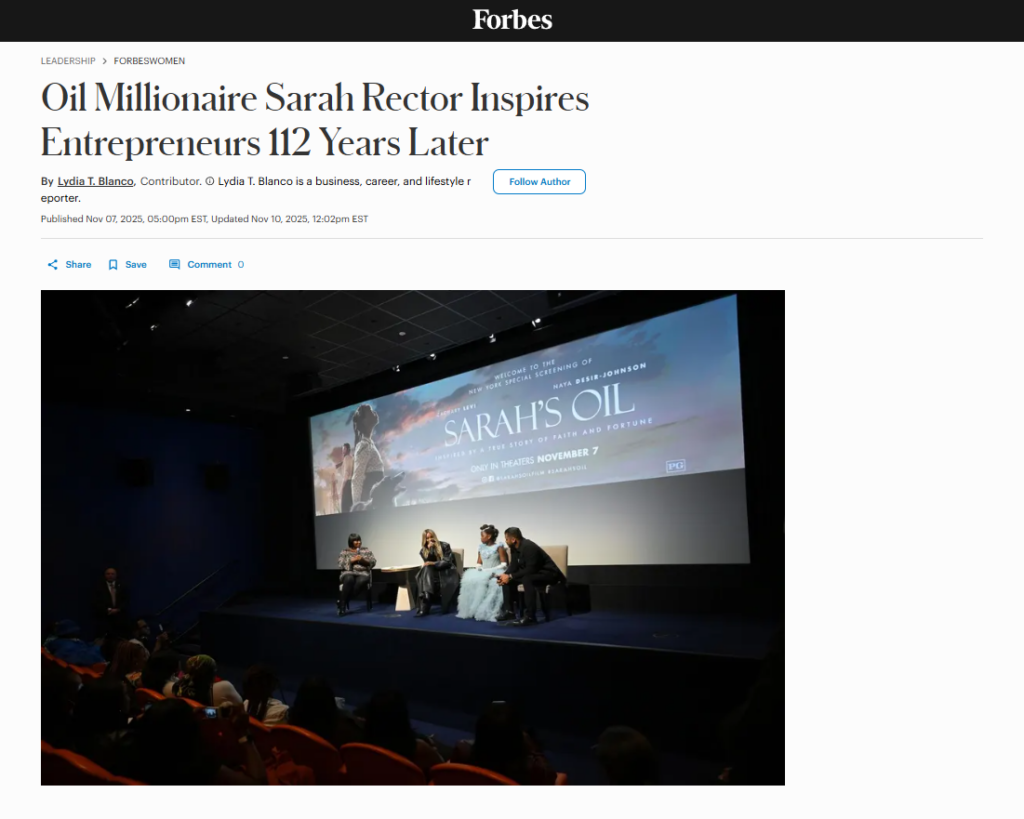 Global business publication Forbes has featured Sarah’s Oil in a recent article titled “Oil Millionaire Sarah Rector Inspires Entrepreneurs 112 Years Later.” The piece revisits the extraordinary life of Sarah Rector — the 11-year-old who became America’s first Black oil millionaire — and explores how her story continues to inspire today’s entrepreneurs and visionaries.